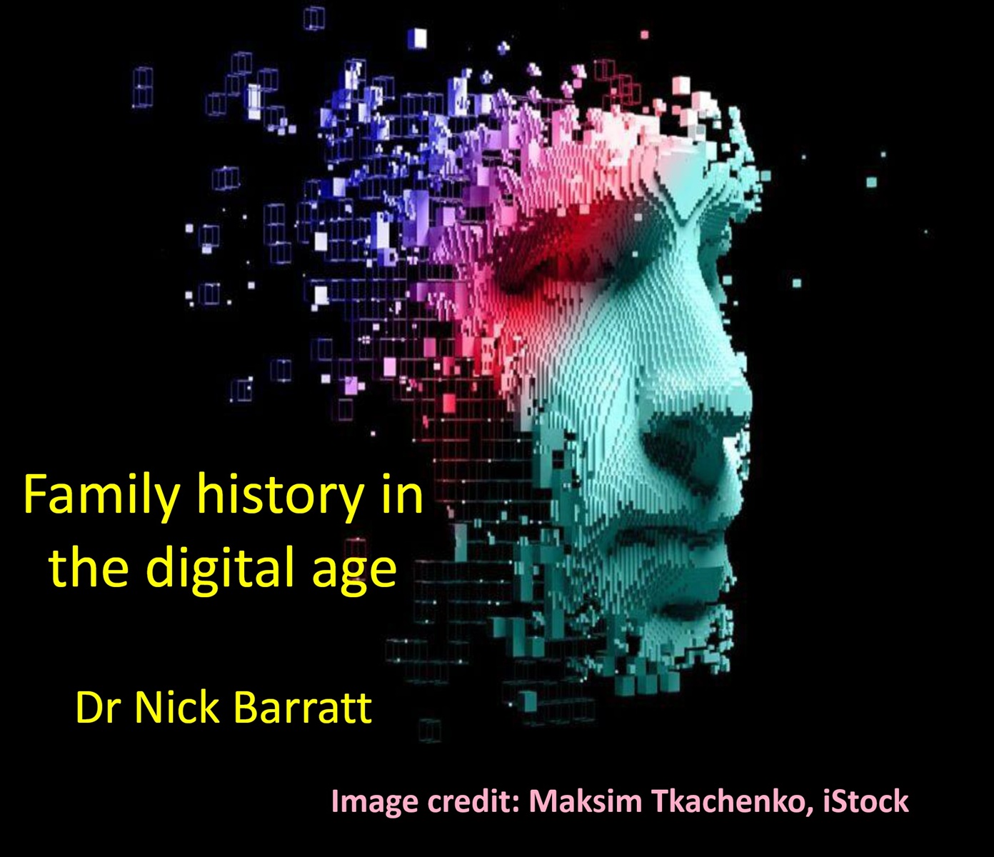 This eye-catching image was Nick Barratt's first slide in his talk to us on 19th February on 'The future of family history in the digital age', a talk which included some rather alarming examples of AI generated avatars and the like. Members can playback Nick's talk from our Playback page, and the talk will be written up in the March journal.